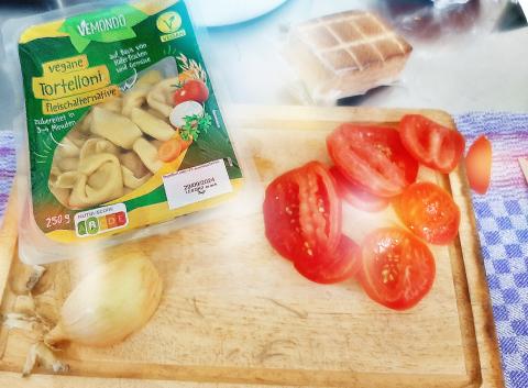 I tak chodziłem i patrzyłem na to wszystko, co mam w kuchni, i tak mnie odrzucało aż aż znalazłem zapomniane z tyłu lodówki z Vemondo(marka wegańska Lidla) Vegane Tortelloni