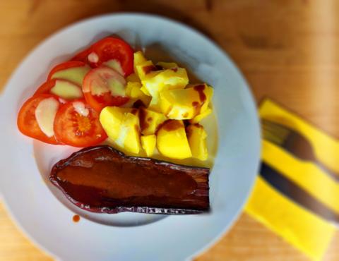 Doskonale konweniuje z ziemniaczkami z wody, pomidorami, sałatą i dipem jogurtowym z czosnkiem niedźwiedzim