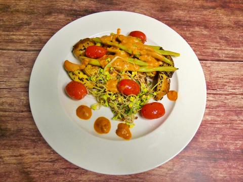 Podane z mixem sałata lodowa, roszponka, rukola z vinaigrette z musztardą francuską, sokiem z limonki olejem konopnym. Olej konopny bardzo dobrze się sprawdza w vinaigrette, chociaż nie każdemu zapewne będzie pasował. ma bardzo charakterystyczny konopny smak i piękny zielony kolor.