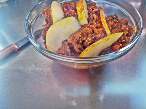 Podajemy z pieczywem. Na grzance, w gorącym sandwiczu. Warto przy podaniu dodać plaster gruszki lub jabłka, możliwie dojrzałych i słodkich. Surowych lub zgrillowanych/przesmażonych. Chociaż pomarańcze czy ananas mogły by tez być ciekawym połączeniem. I całkowicie staropolskim. W kuchni staropolskiej łączono owoce z daniami wytrawnymi, również te egzotyczne